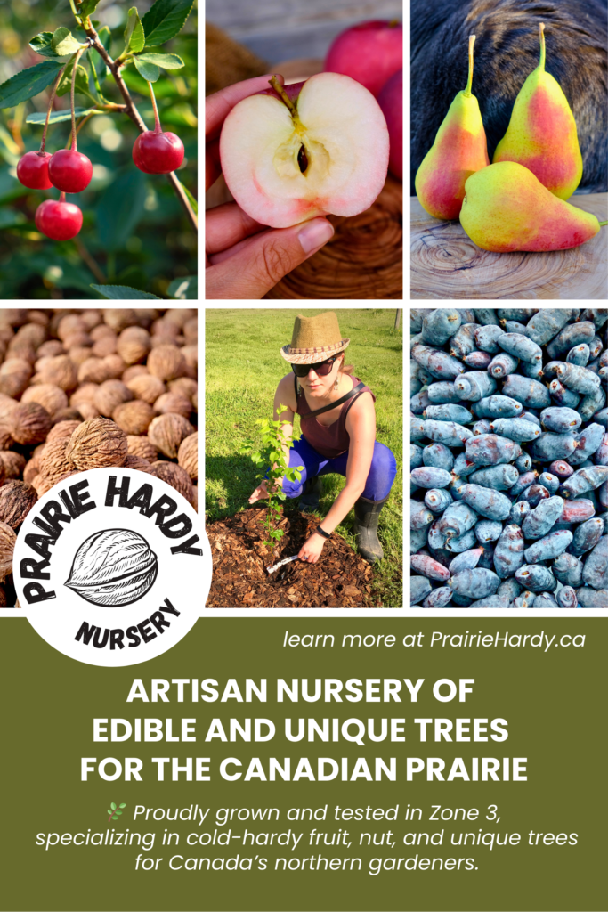 Prairie Hardy Nursery is an artisanal fruit and nut tree nursery specializing in cold-climate growing for Zones 2, 3, and 4. We grow and graft carefully sourced cultivars and seedlings chosen for flavour, prairie hardiness, and disease resistance, all tested and grown in Zone 3. Our trees are raised in living, nutrient-rich soil using organic, regenerative methods rooted in permaculture and old-world techniques, without synthetic fertilizers, herbicides, or pesticides. We are deeply committed to preserving hardy genetics while offering high-quality trees at an accessible price. Gardening enthusiasts from across Canada trust Prairie Hardy Nursery for honest, hands-on experience and plants proven to thrive in the toughest climates.
